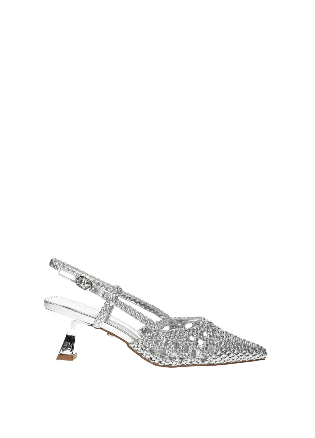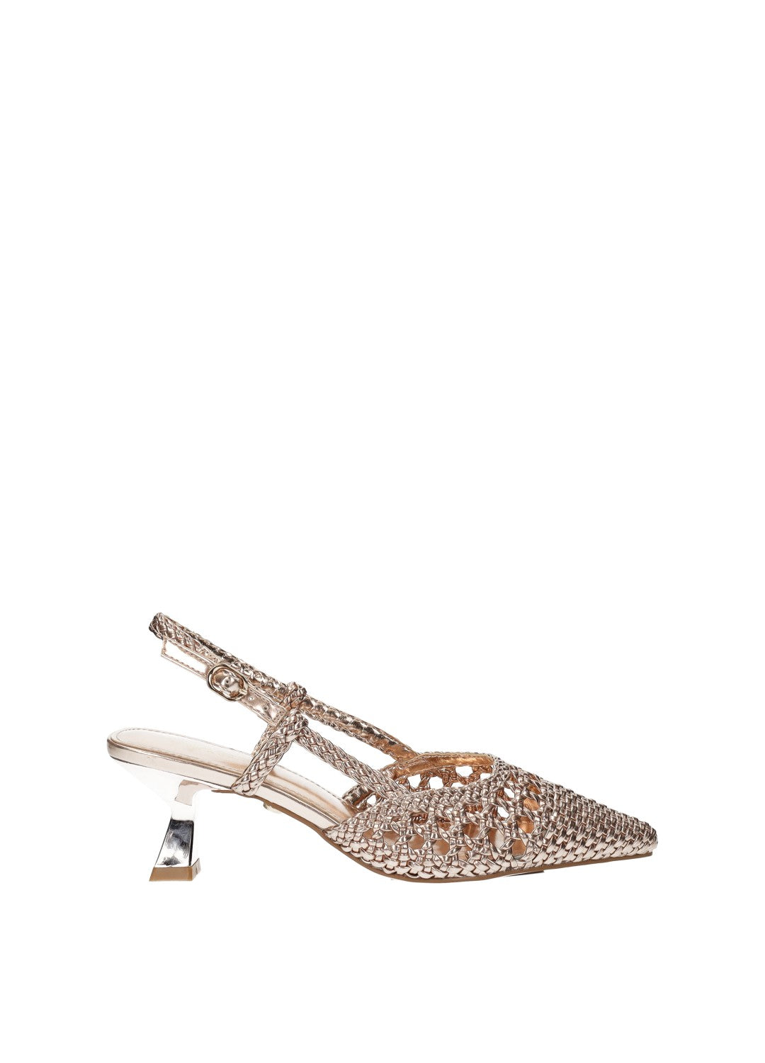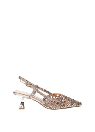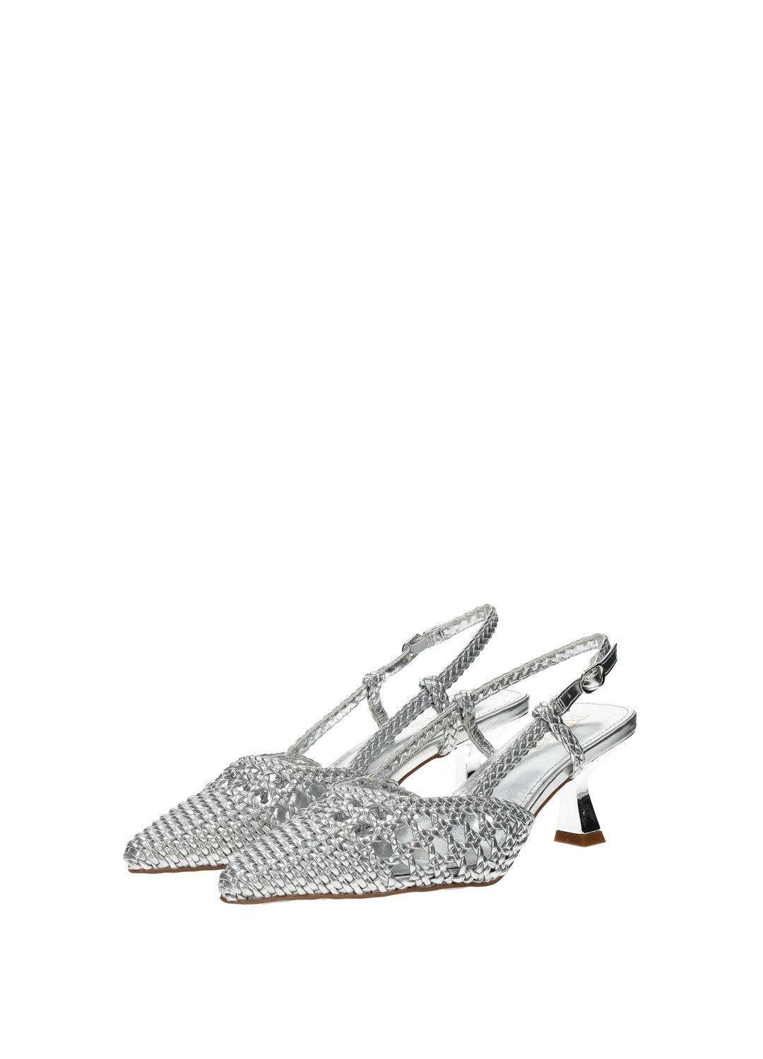 Décolleté intrecciate in ecopelle con tacco di 6 cm. effetto metallizzato .