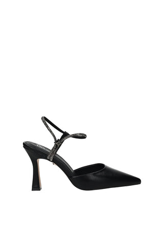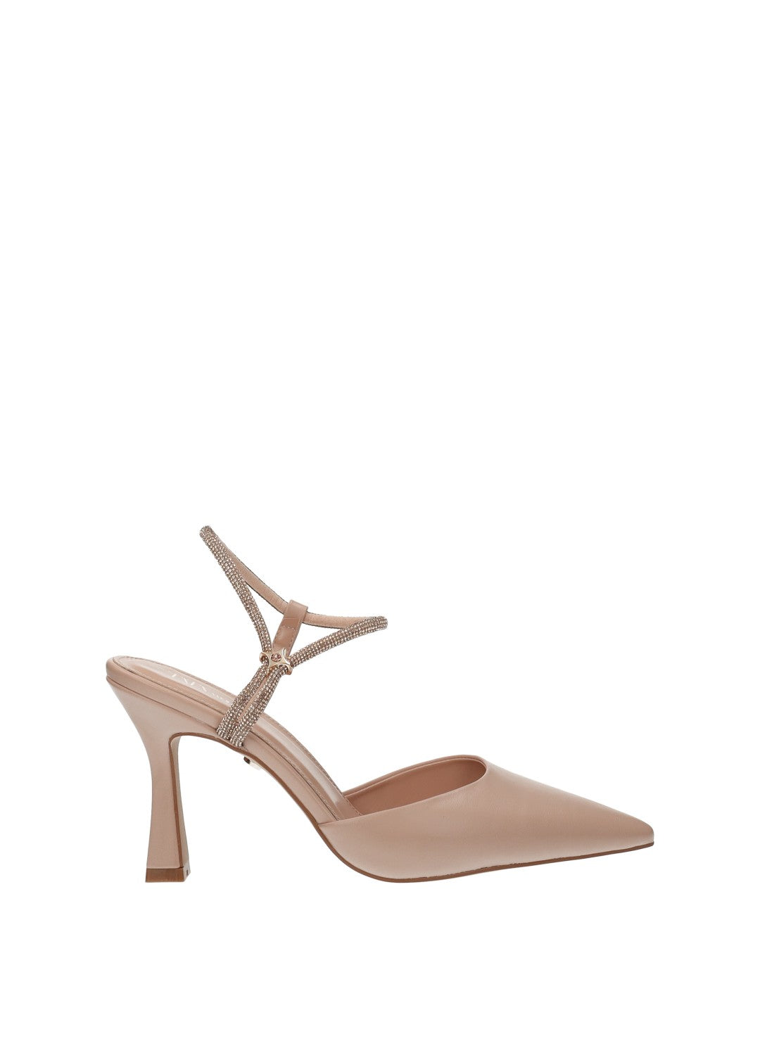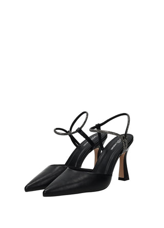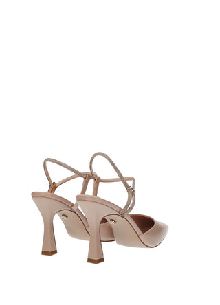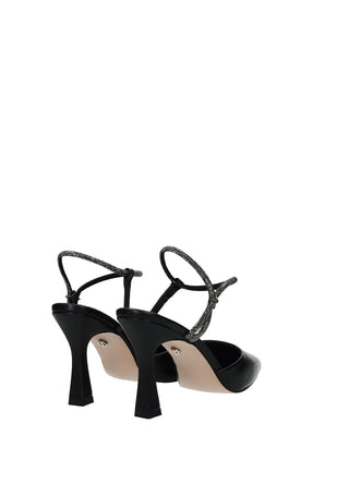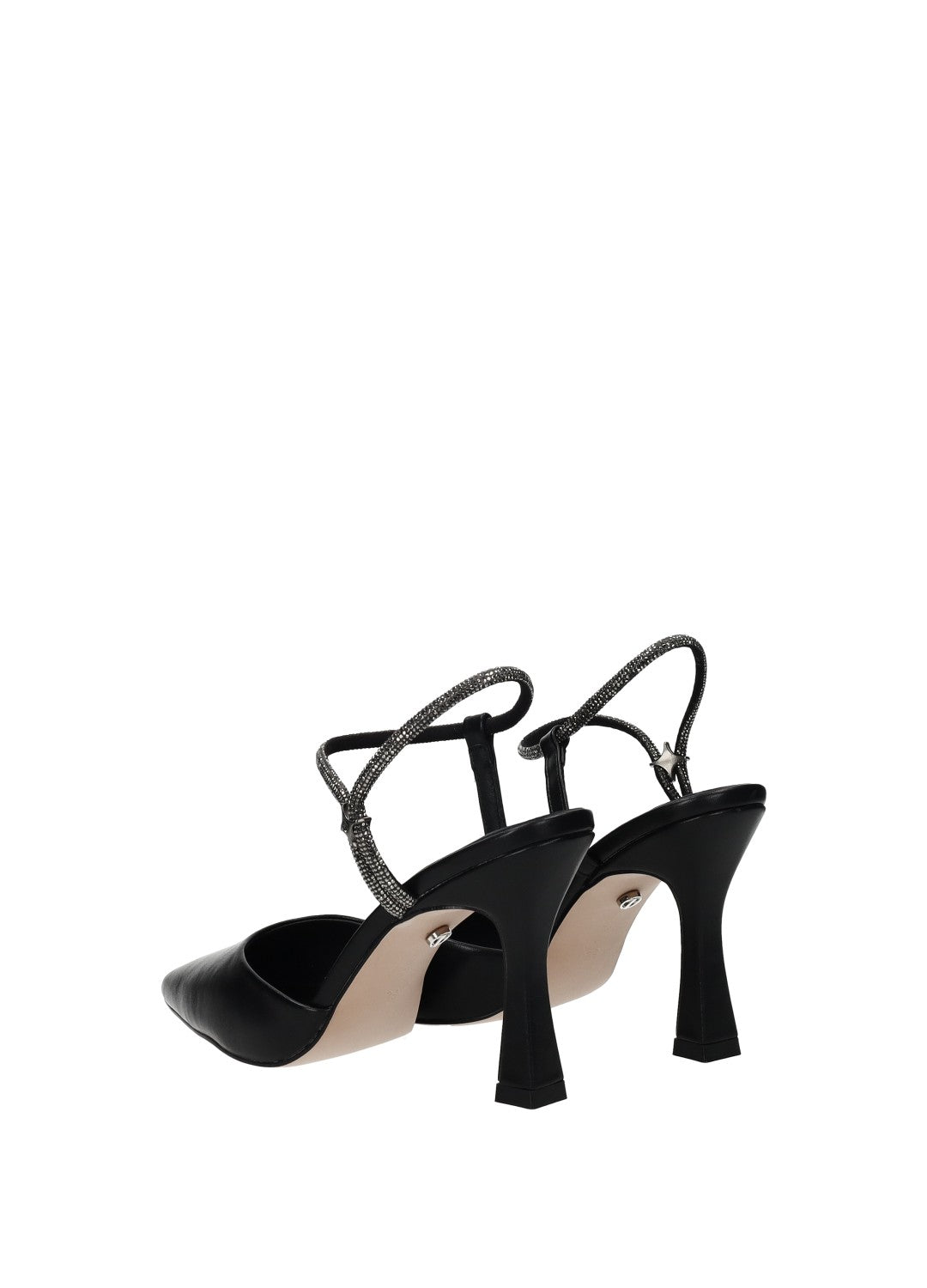 Décolleté slingback effetto pelle con listini strass e tacco di 10 cm.