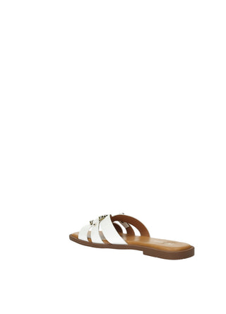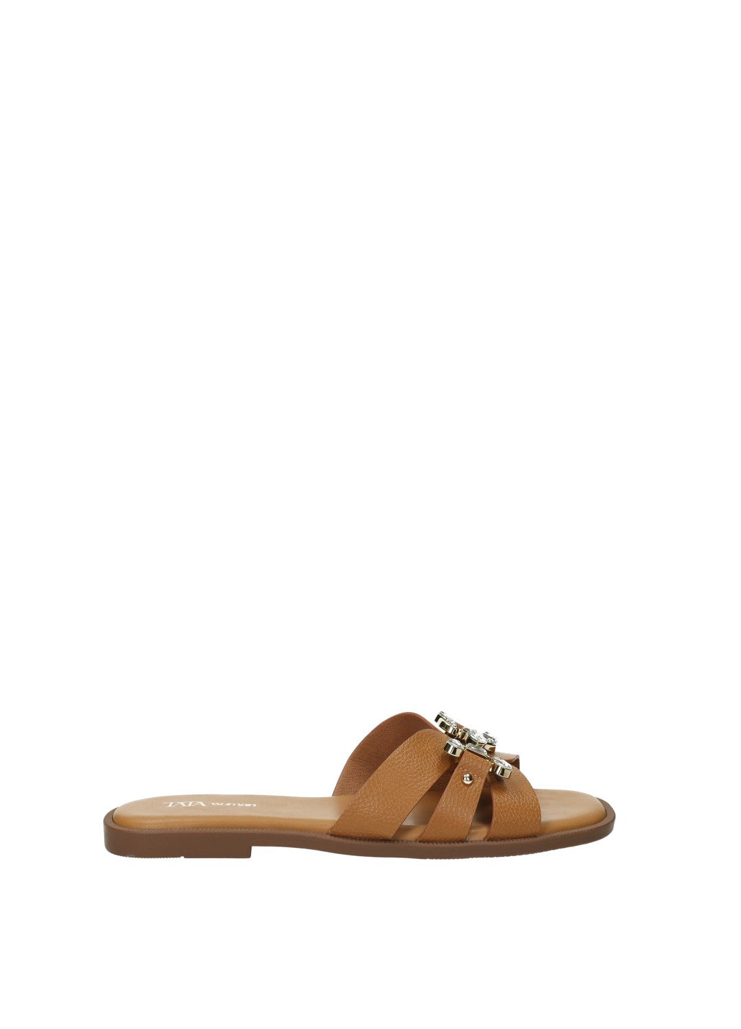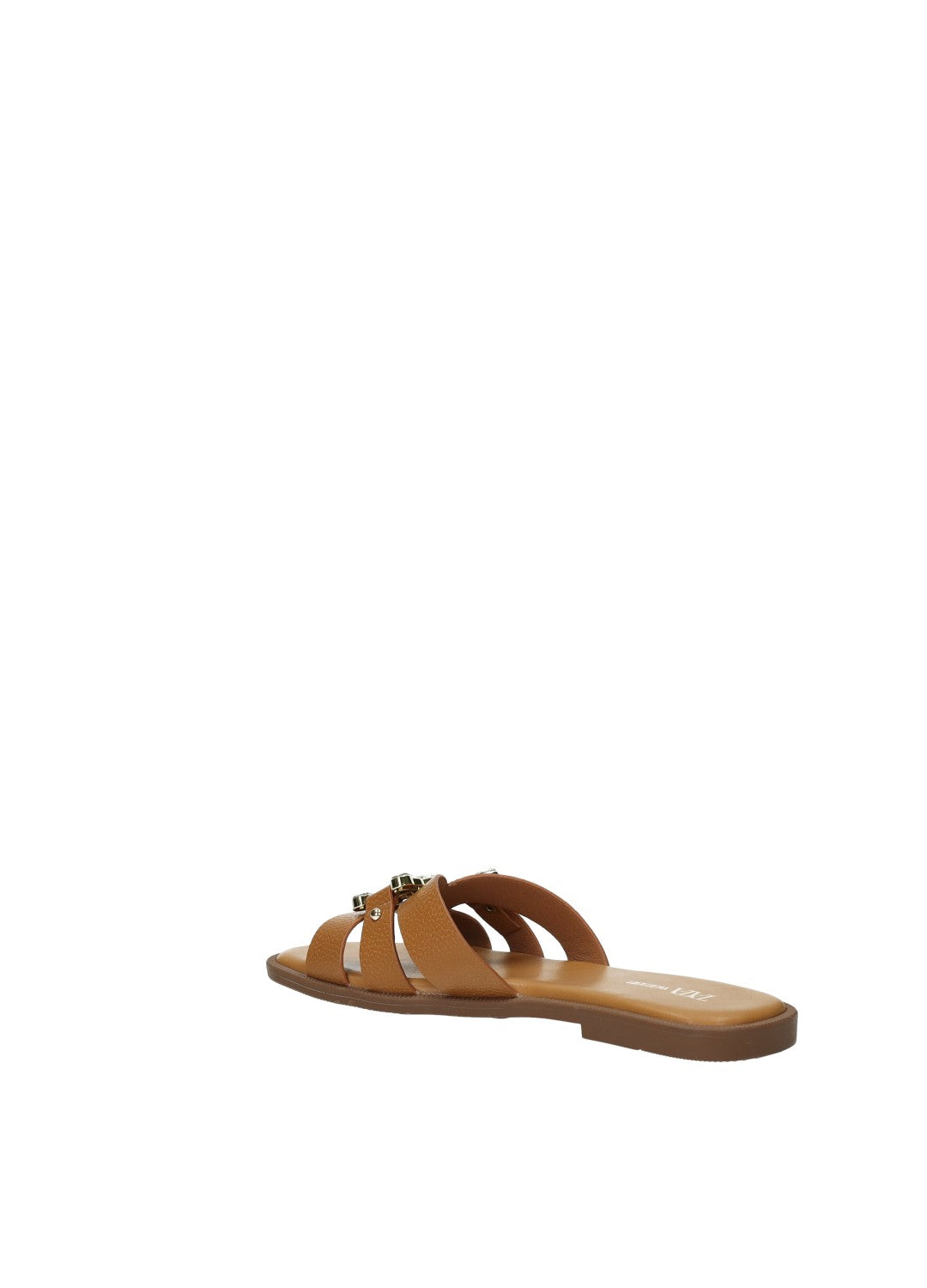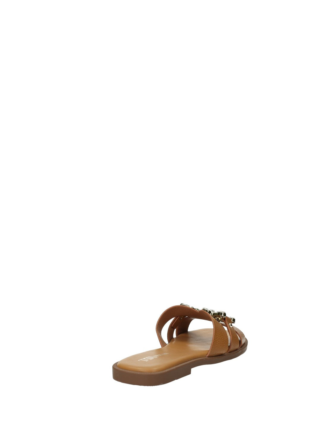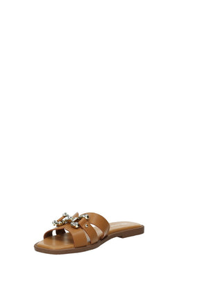 Sandali effetto pelle con fibbia gioiello e fondo in gomma.