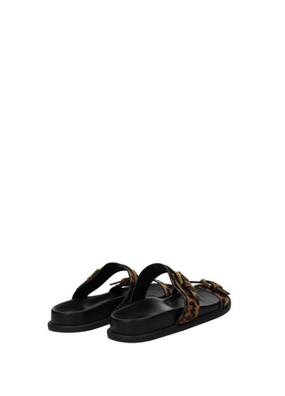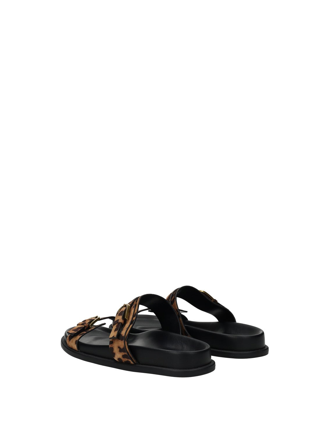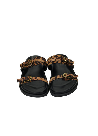 Sandali in microfibra con doppia fascia animalier e fondo in gomma.